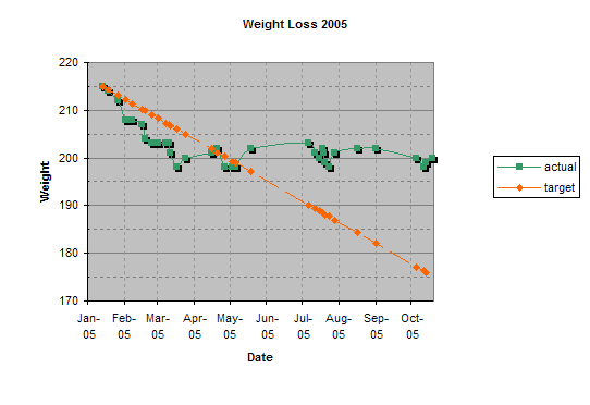 As the chart shows, I made good progress down to 200, and I’ve pretty much plateaued there, plus or (slightly minus) since March. Dagnabbit. It’s not a matter of body “thermostat,” I don’t think — just a matter of not actually being as diligent about not snacking as I really ought to be, not exercising as much as I should, and too many “exceptions” on too many evenings.