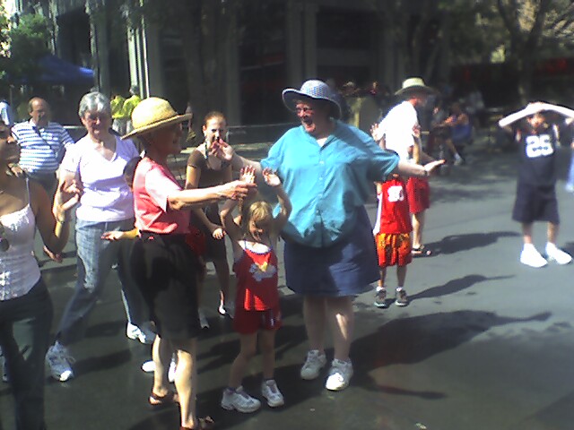 Getting cooled off at a water-squirting giant Coke bottle at Disney-MGM. UPDATE: This photo got swallowed by airblogging. Reposted 6/3. Ginger, Gloria, Katherine, and Margie are all in the picture….