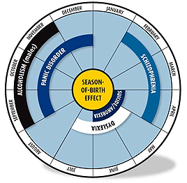 to be born later in the year, however. Autumn birthdays are associated with an 8 per cent increase in the likelihood of suffering panic attacks, for example, and a small but significant increase in alcoholism in men.