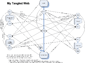 Certain elements are highly abstracted — “My Blogs,” for example. The point was to show the intricate interplay between my PC and Blackberry (and their browsers and GMail) and my blogs, Google Reader, Twitter, and Facebook — most specifically, how doing something on one of them can ripple through several others. This is by design, since I bloody hate cross-posting stuff, but it is something I have to bear in mind whenever I post something somewhere.