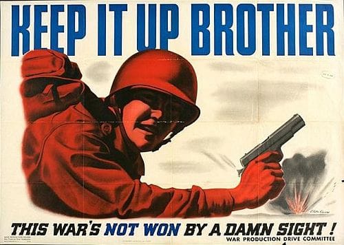 Is the OP suggesting that we need a similar set of posters in support of the War on Terror — a picture of a Predator drone dropping a missile toward a small building somewhere, with an urging to “Buy War Bonds!”? (Maybe if we had an actual bond program, or sufficient taxes raised to actually pay for the wars in Iraq and Afghanistan, that might be appropriate.)