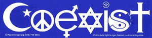 So about a year ago, Margie came home with this cool bumper sticker that says “COEXIST” on it — with each of the letters representing a different belief / tradition.