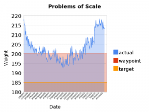 My short-term goal is to get back down below 200 again (the “Waypoint” on the chart). There’s something magic about that number. Plus, all my pants would fit again.