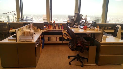 As mentioned previously, my group got moved upstairs to new cubicleage. In the process, they swapped in a nice standing desk unit, on the right, which can easily rise up and down to any designed height. Spiffy!