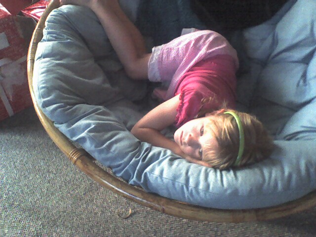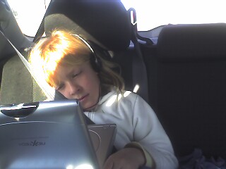 UPDATE: For the record, Katherine was great on the trip. I read to her (and Mommy) for large chunks of the drive (Gaiman’s Stardust), and much of the rest of the time she just rested (been a long couple of days for her), watched her little DVD player (as shown), or just watched stuff. Made the trip quite nice.